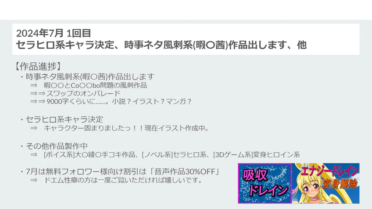 ブログが〇んでしまいました。 「吸収ドレイン」で検索していただけると助かります。 吸収ドレイン公式サイト http://kyusyudrain.com/ 【作品進捗】 ・時事ネタ風刺系(暇〇茜)作品出します ⇒ 暇〇〇とCo〇〇bo問題の風刺作品 ⇒ ⇒ スワップのオンパレード ⇒ ⇒ 9000字くらいに……。小説?イラスト?マンガ? ・セラヒロ系キャラ決定 ⇒ キャラクター固まりましたっ!!現在イラスト作成中。 ・その他作品製作中 ⇒ [ボイス系]大〇綾〇手コキ作品、[ノベル系]セラヒロ系、[3Dゲーム系]変身ヒロイン系 ・7月は無料フォロワー様向け割引は「音声作品30%OFF」 ⇒ ドエム性癖の方は一度ご覧いただければ嬉しいです。 【宣伝とか】 ・Gumroad有料プラン始めました、無料プランも割引あります ⇒ 有料プランはどれでも1品30%OFF割引クーポン付き!! ※届いてない方、DMください。 ⇒ 7月の無料プラン割引は「音声作品30%OFF」 ⇒ 今週の有料プランコンテンツは「セラヒロキャラ先行チョイ見せ」です。 ・新作紹介 ・Youtubeに動画出してます、また出します。 ⇒ 今んとこStableDiffusionだよなあ…… ・雑談 ⇒ 生成AI問題について(第2回目) テーマ:一番の被害者って? どうして現場に血が流れるんだ!