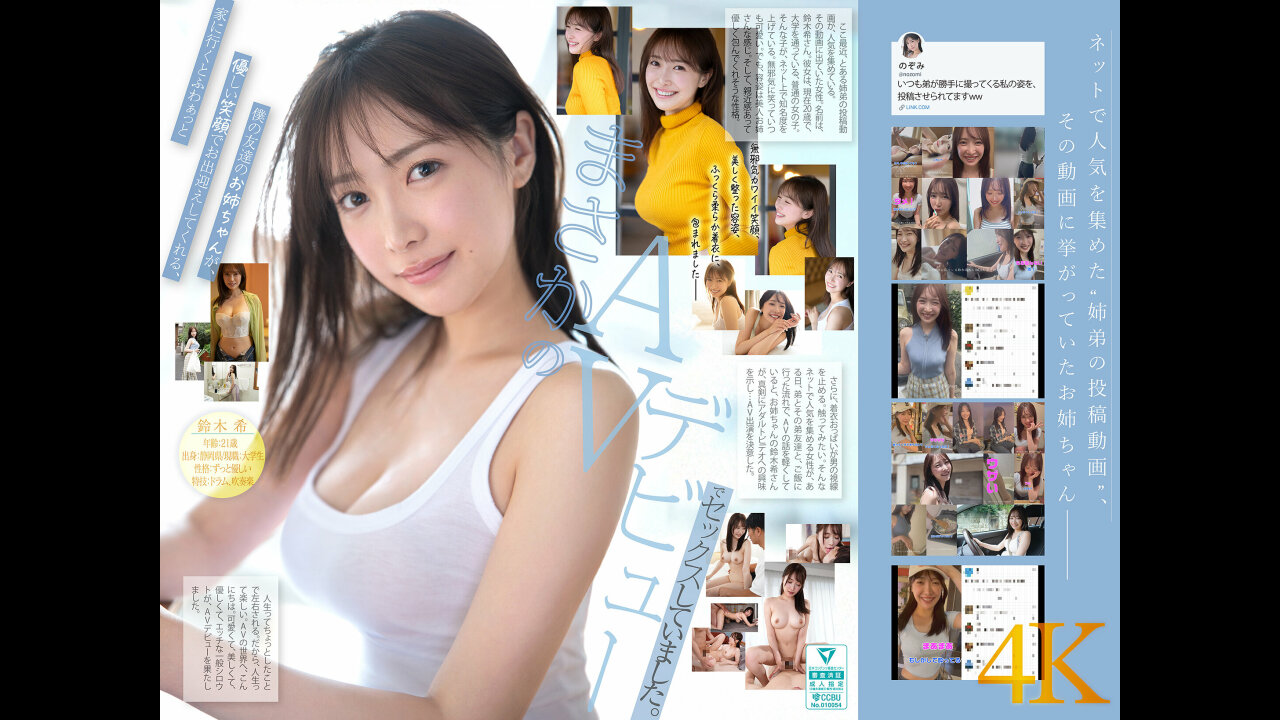 ここ最近、とある**の投稿動画が人気を集めている。その動画に出ている女性。鈴木希さん。彼女は現在20歳で、大学に通っている、普通の女の子。そんな子が、ネット上で知名度を上げている。無邪気に笑っていつも可愛い。でも、容姿は美人お*さんな感じ。そして、親近感あって優しく包んでくれそうな性格。さらに、着衣おっぱいが男の視線を止める。触ってみたい。ネットで人気を集める女性がある日、*とその*友達とご飯に行った流れで、AVに関しての話を軽くしていると、お*ちゃんの鈴木希さんが真剣にアダルトビデオへの興味を示し…AV出演を決意した。*と*友達とAVの話をするってのが面白いですよね。人生ってちょっとしたことで左右される。人生の選択肢って面白いものだ。